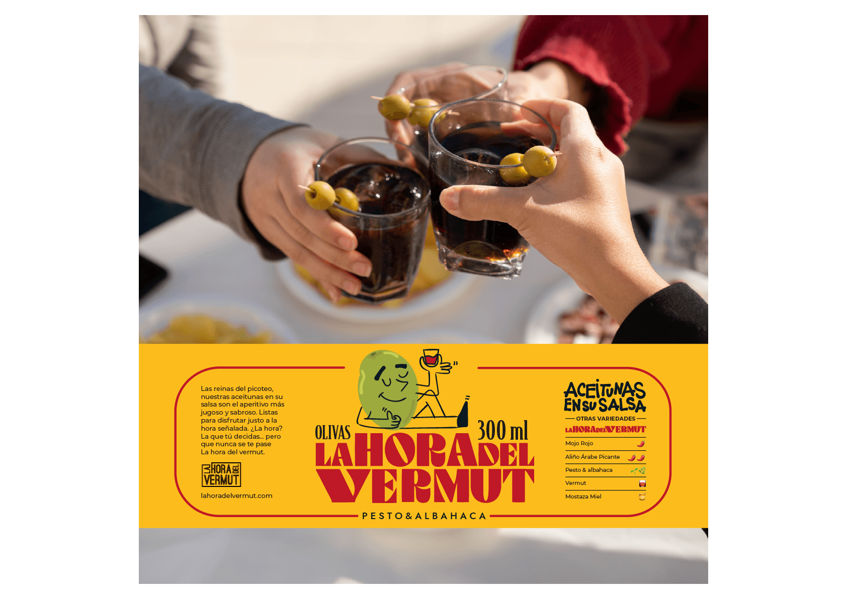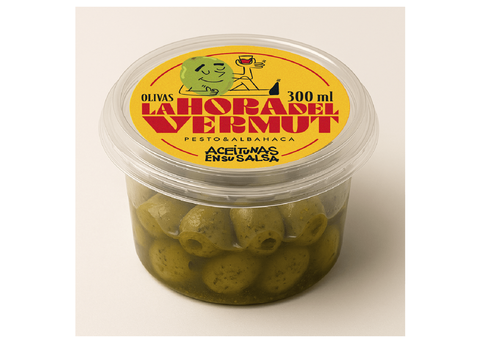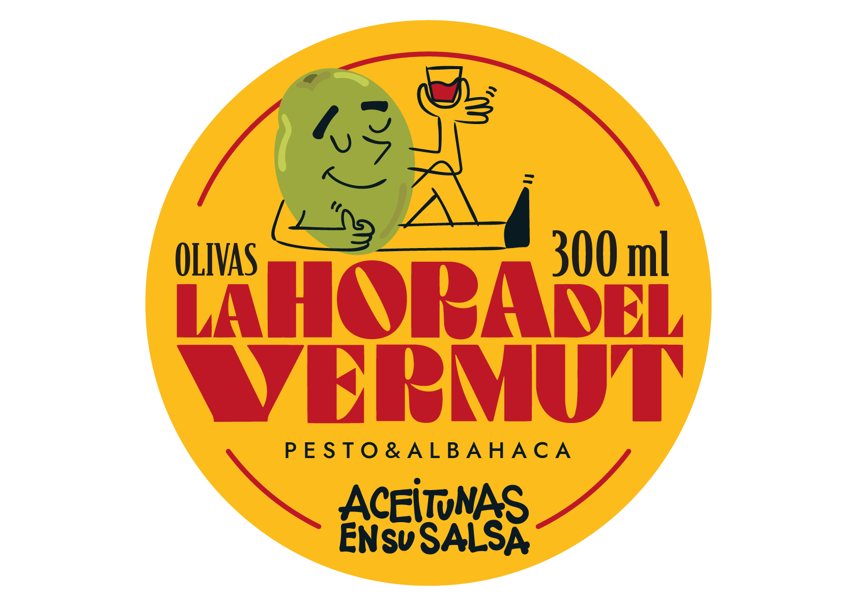 En esta propuesta apostamos por crear un personaje: la propia aceituna. Con una actitud desenfadada, relajada y disfrutona, la aceituna se toma un vermut, transmitiendo una imagen de disfrute y descanso. Esta ilustración no solo le aporta personalidad y cercanía a la marca, sino que también nos permite dotarla de versatilidad: el personaje puede animarse, adoptar diferentes posturas y adaptarse a futuras comunicaciones o nuevas variedades de producto.