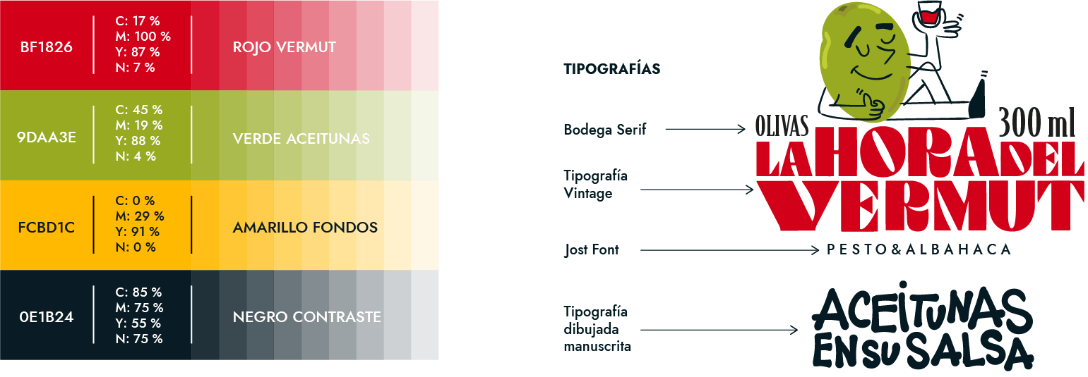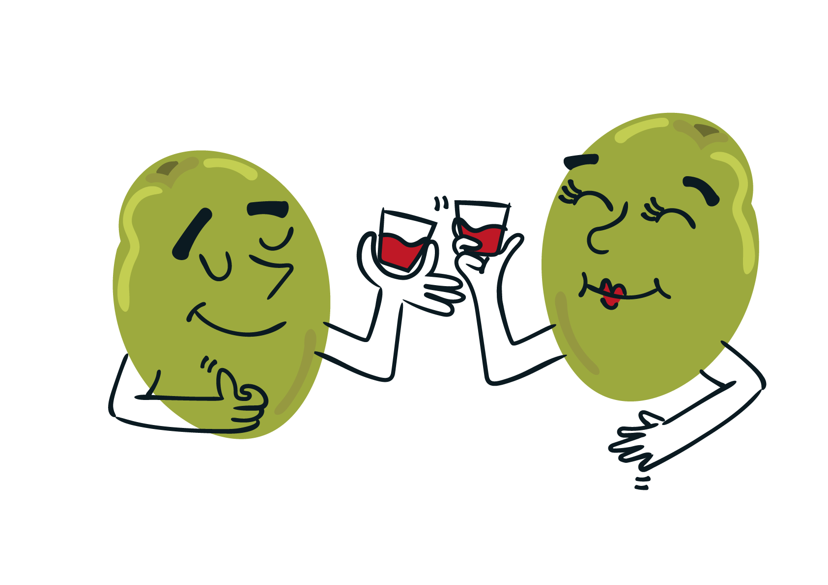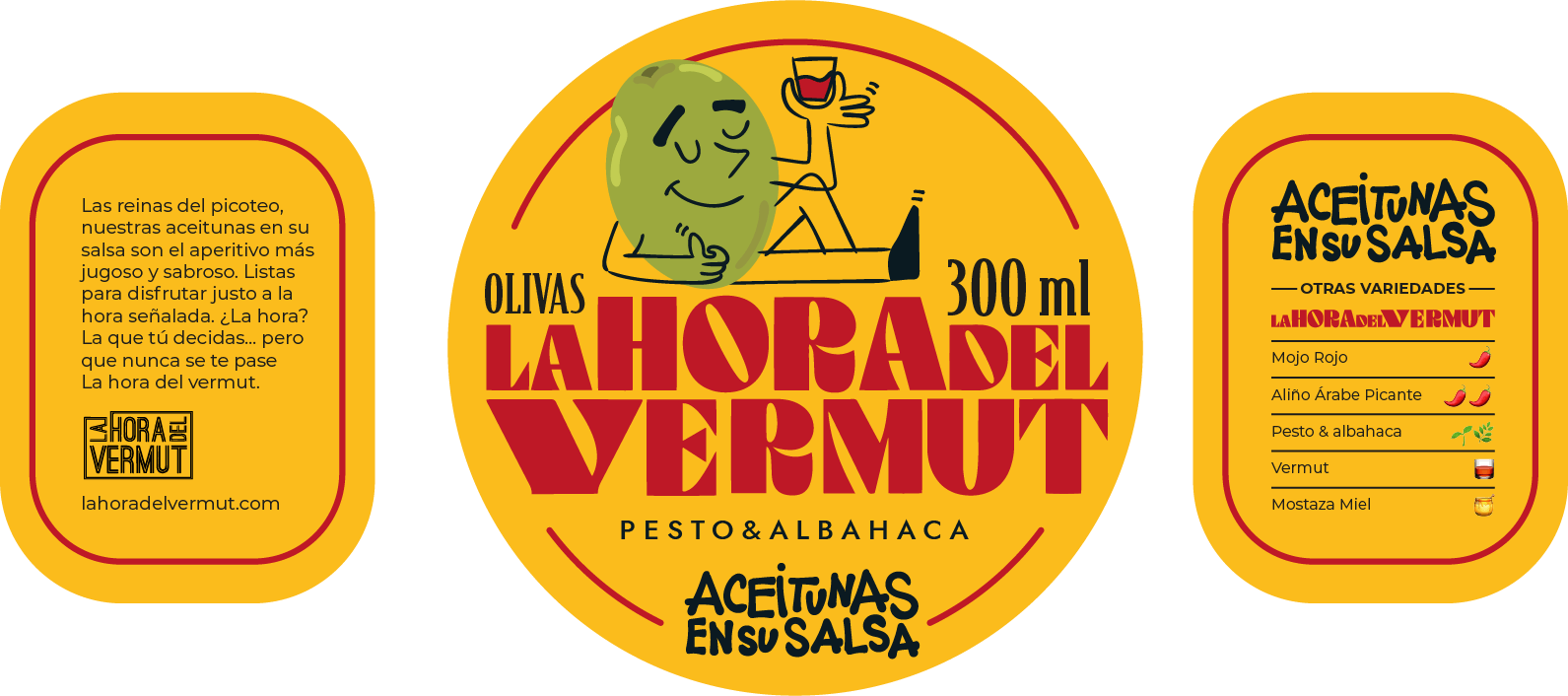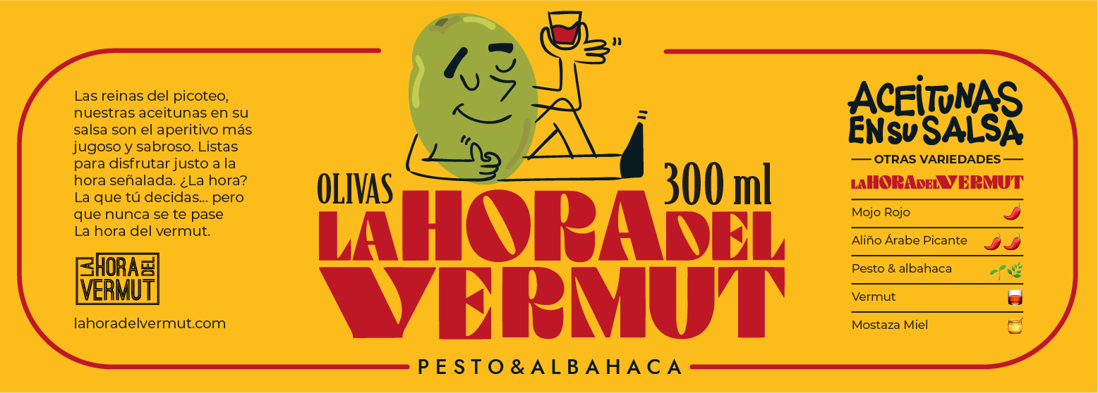 En esta propuesta apostamos por crear un personaje: la propia aceituna. Con una actitud desenfadada, relajada y disfrutona, la aceituna se toma un vermut, transmitiendo una imagen de disfrute y descanso. Esta ilustración no solo le aporta personalidad y cercanía a la marca, sino que también nos permite dotarla de versatilidad: el personaje puede animarse, adoptar diferentes posturas y adaptarse a futuras comunicaciones o nuevas variedades de producto.