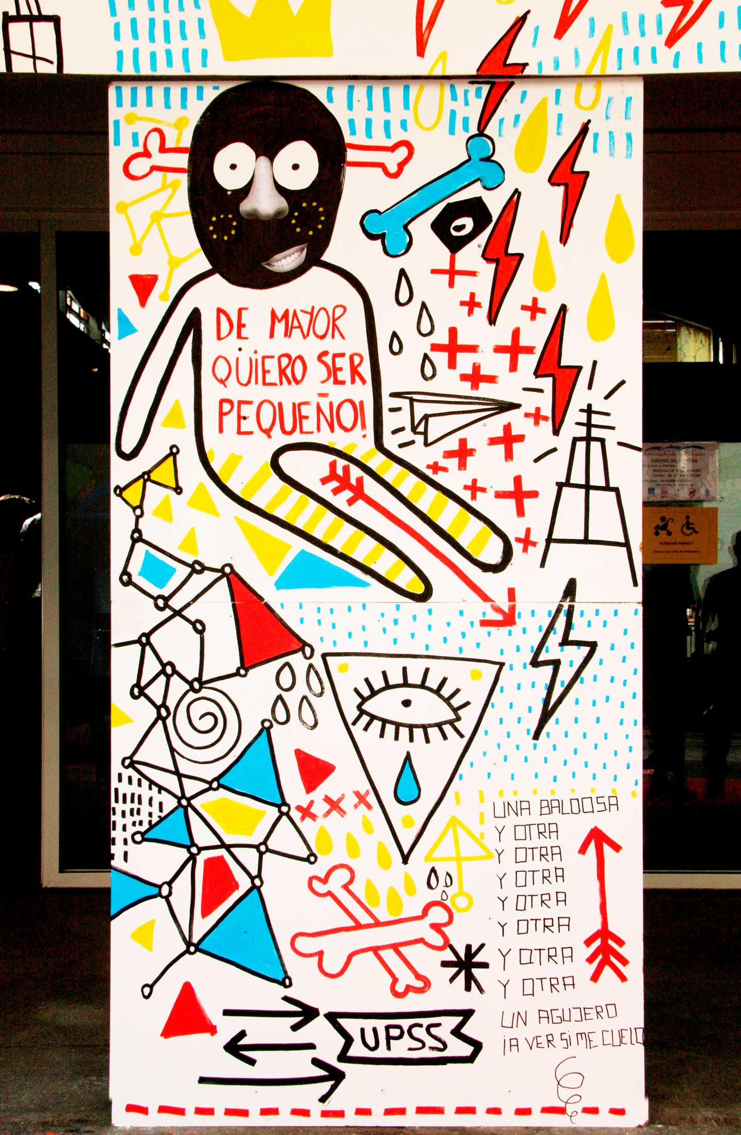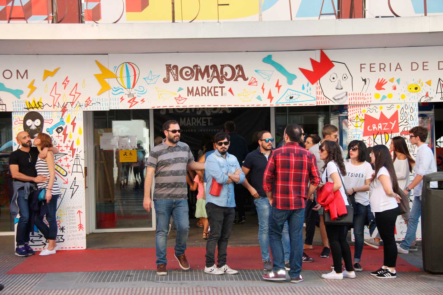 CRAZY KIDS con METEORO Art Collective / Nómada Market, Feria de diseño independiente en el Mercado de la Cebada. Intervención en vivo durante el primer día de la feria, generando visibilidad y notoriedad y creando un marco atractivo con la imagen de la feria pero hecho a mano. Talleres de arte urbano enseñando técnicas que van desde el spray, stencil o rotulación, hasta el collage y la creación de personajes, adaptándolas a los niños según sus edades y aptitudes e incentivando la colaboración entre ellos y nosotros. Mural participativo para todos los públicos, donde aplicamos la técnicas del taller en una zona muy concurrida de la entrada, donde la gente puedo probar los materiales y dejar su huella de una manera muy natural y divertida.