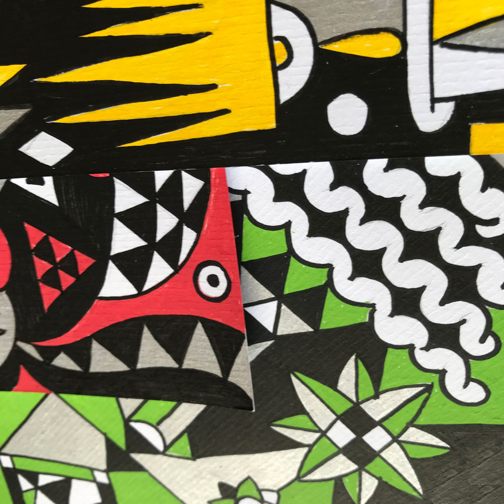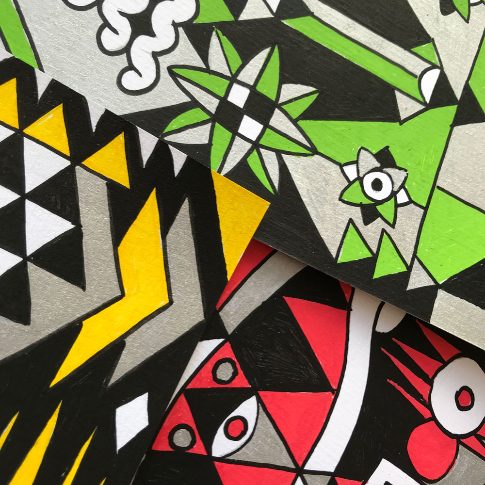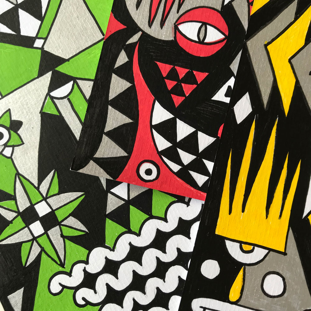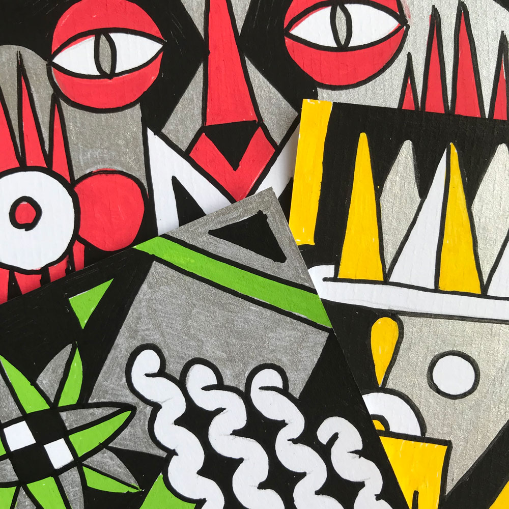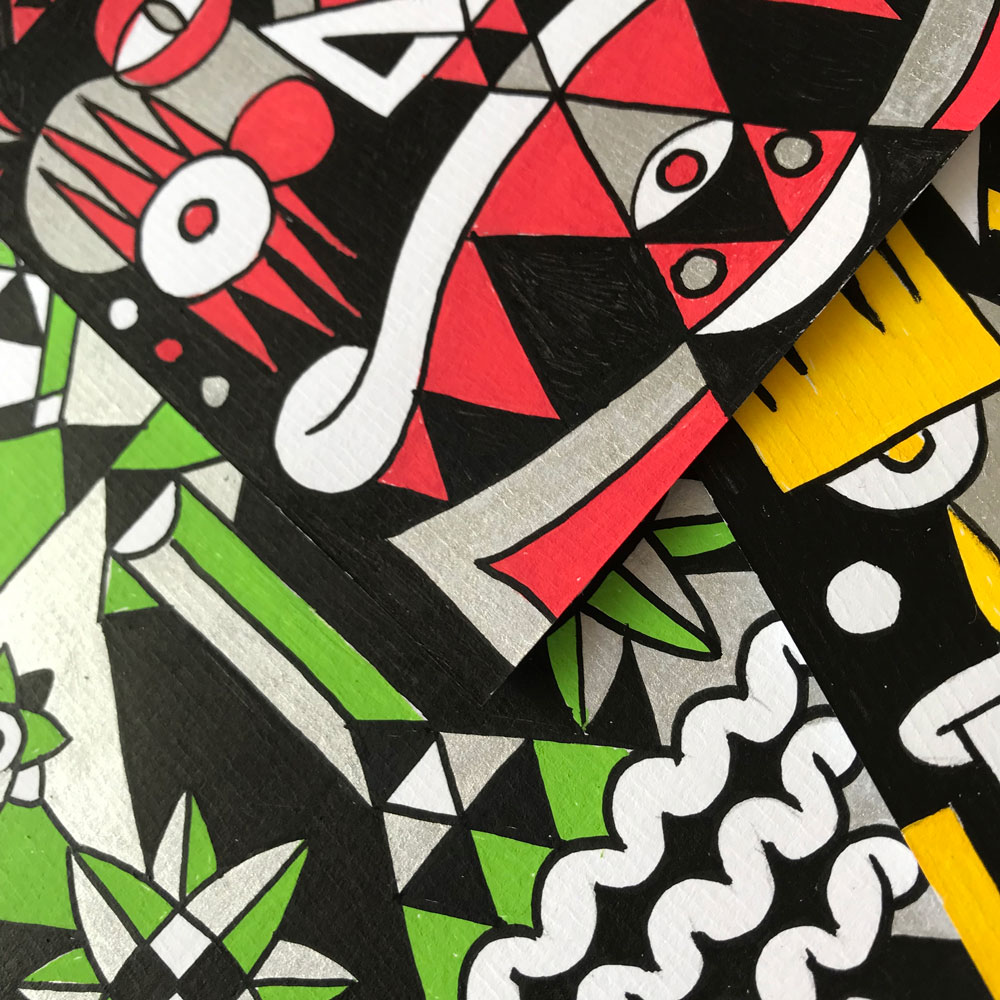 Ilustraciones reversibles a rotulador acrílico rojo, verde, amarillo y plata, sobre papel texturizado.