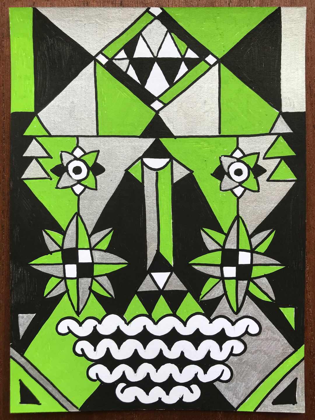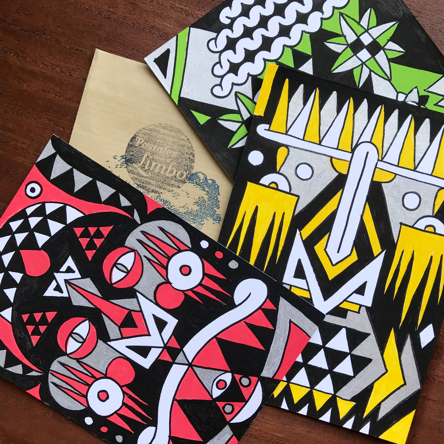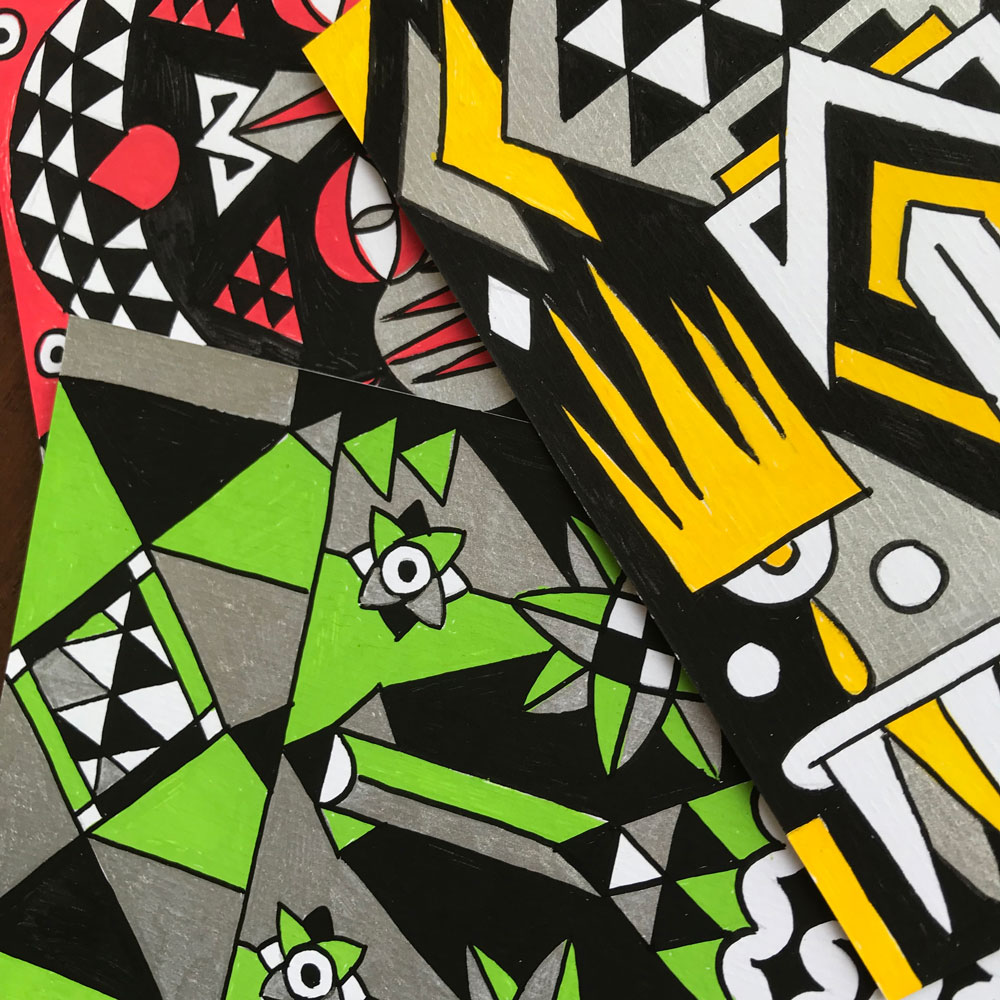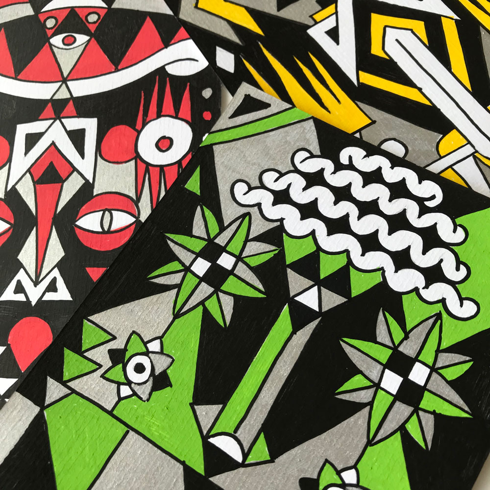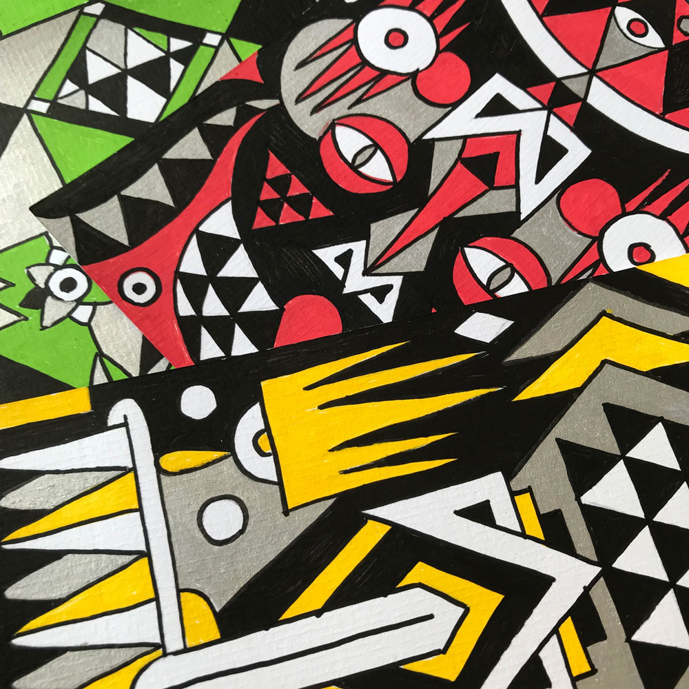 Ilustraciones reversibles a rotulador acrílico rojo, verde, amarillo y plata, sobre papel texturizado.