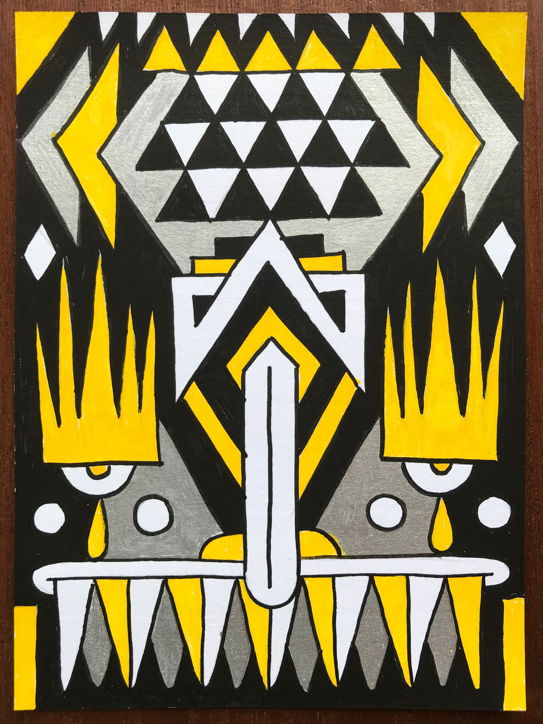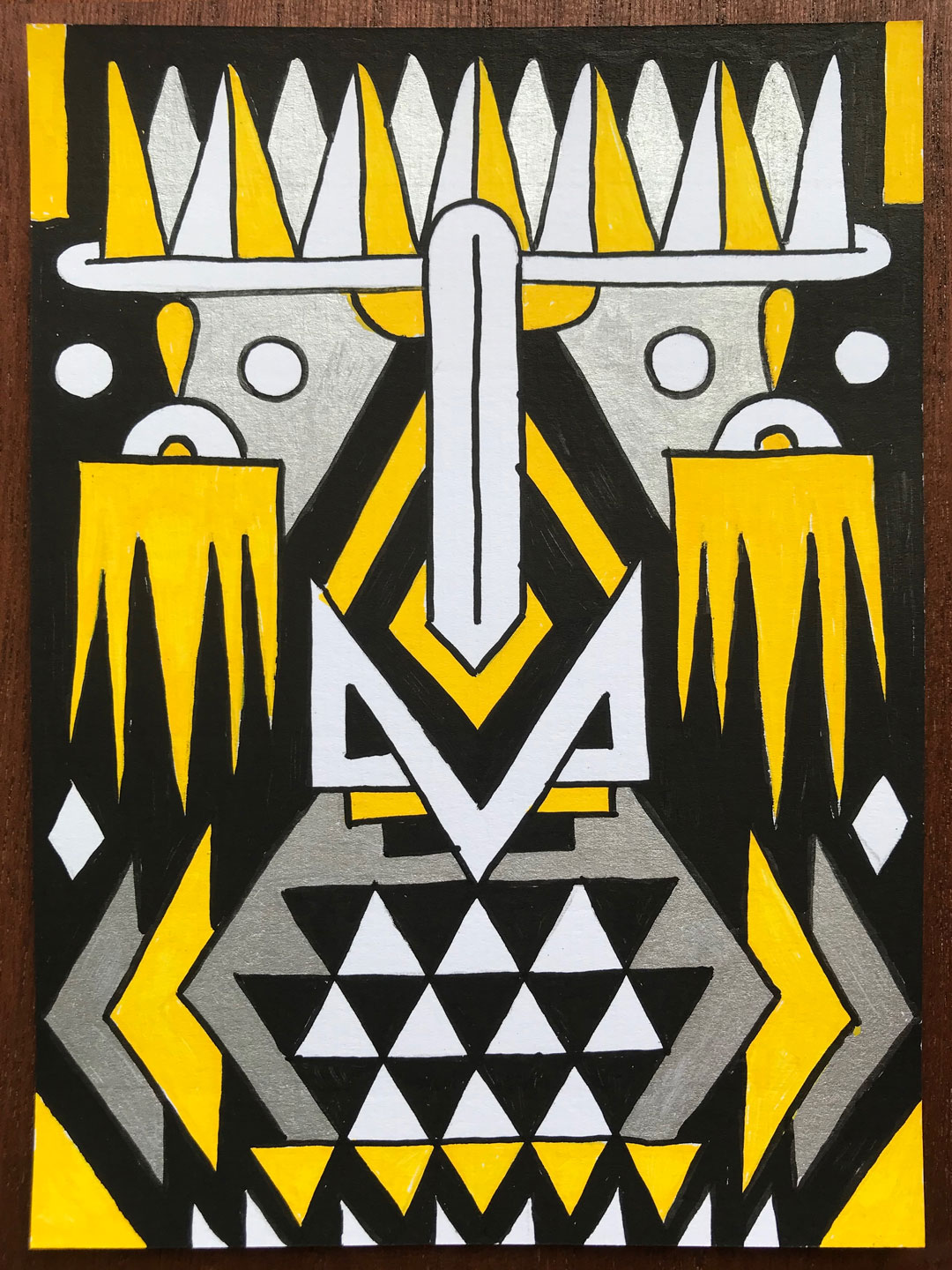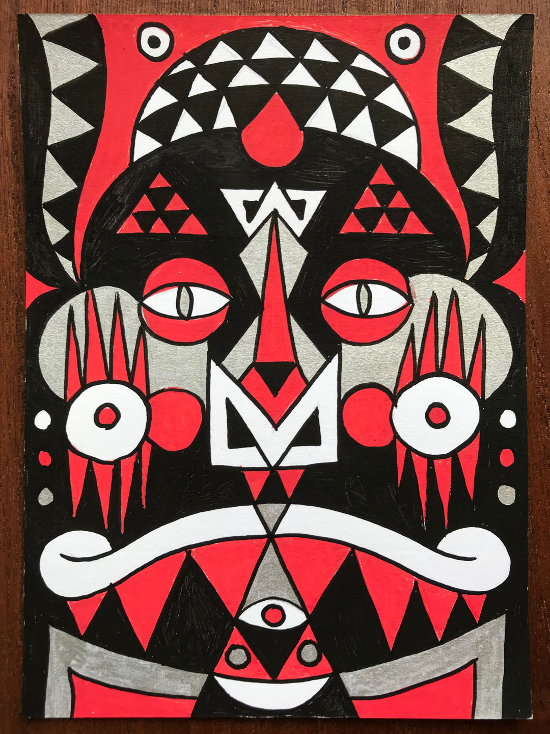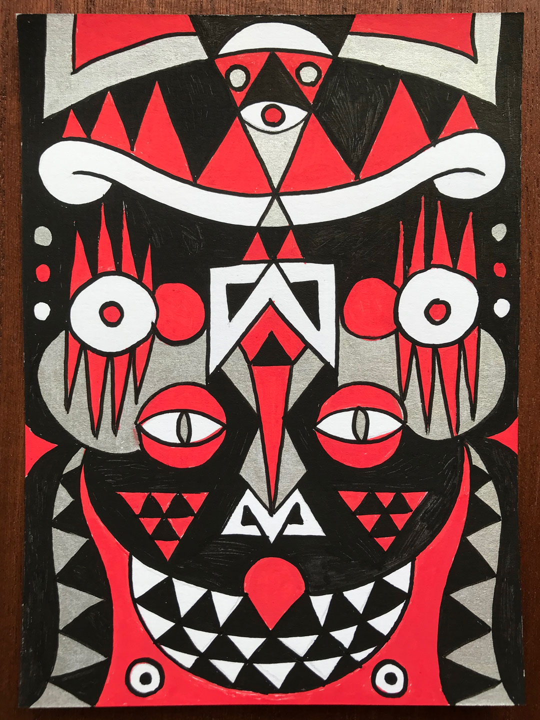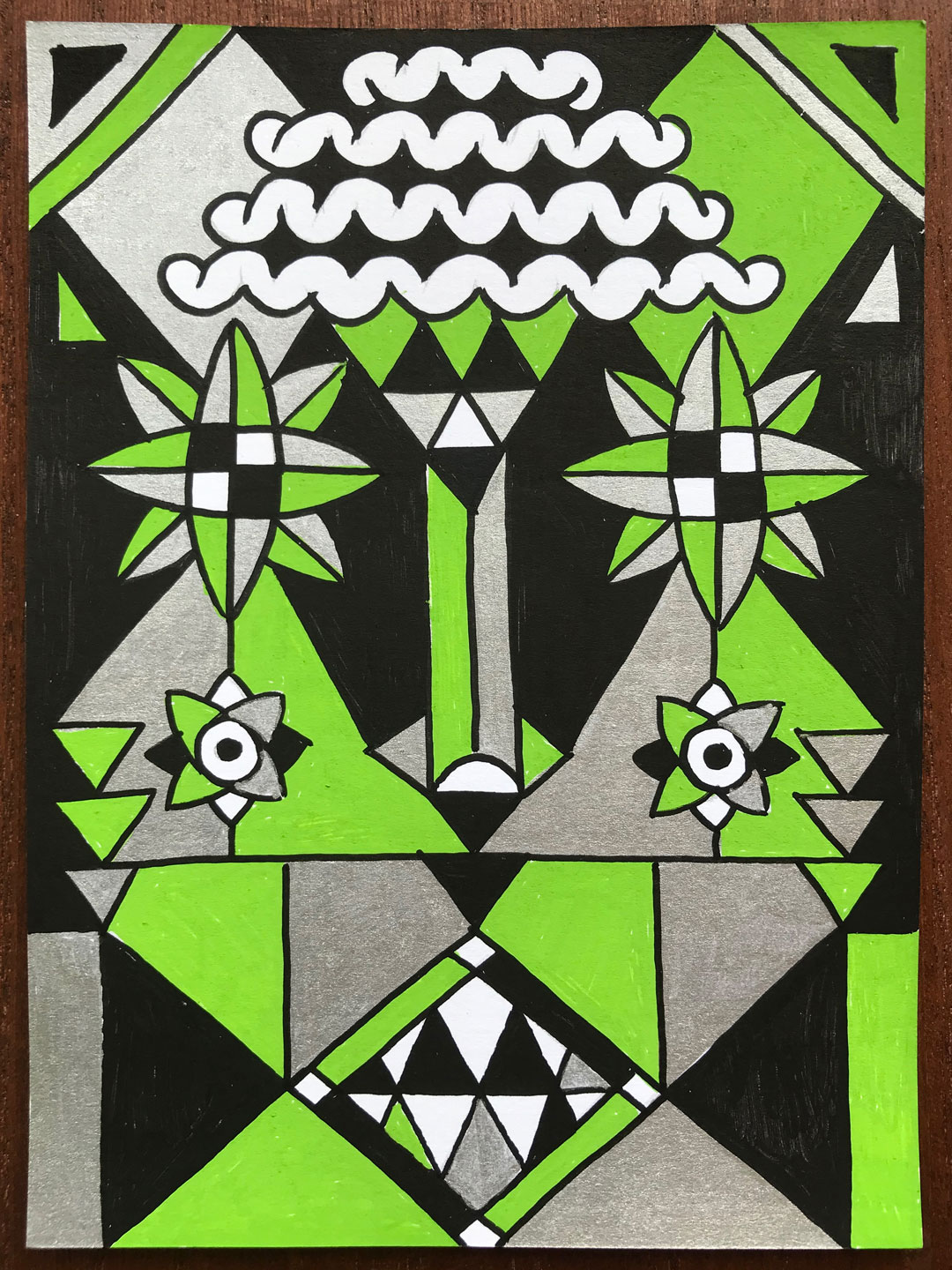 Ilustraciones reversibles a rotulador acrílico rojo, verde, amarillo y plata, sobre papel texturizado.